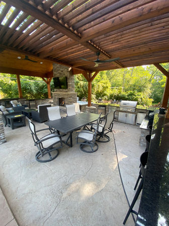 Concrete - Stamp: Fractured EarthColor: Mixed to match concrete color homeowner already hadStone - Stone Style: LaytiteStone Color: Bucks CreekStone Accents: CreamGranite: Black Uba Tuba